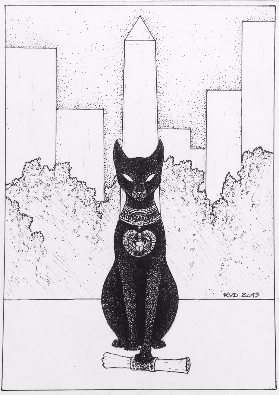 New Cairo archeologists have discovered an ancient container with three cats on the cover and the above inscription. It contains a scroll. Please advise in person, the third of Osiris, three a.m. at Cleopatra’s Needle in Central Park.